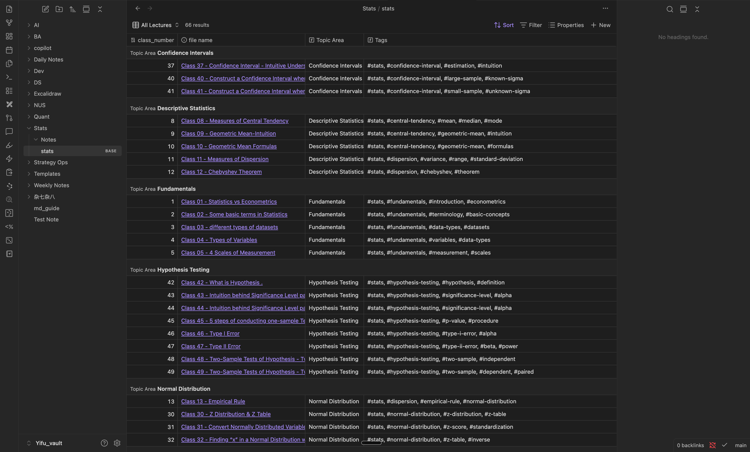 Opening Obsidian, I could see the generated Base view, allowing me to easily filter and manage these 66 lessons.