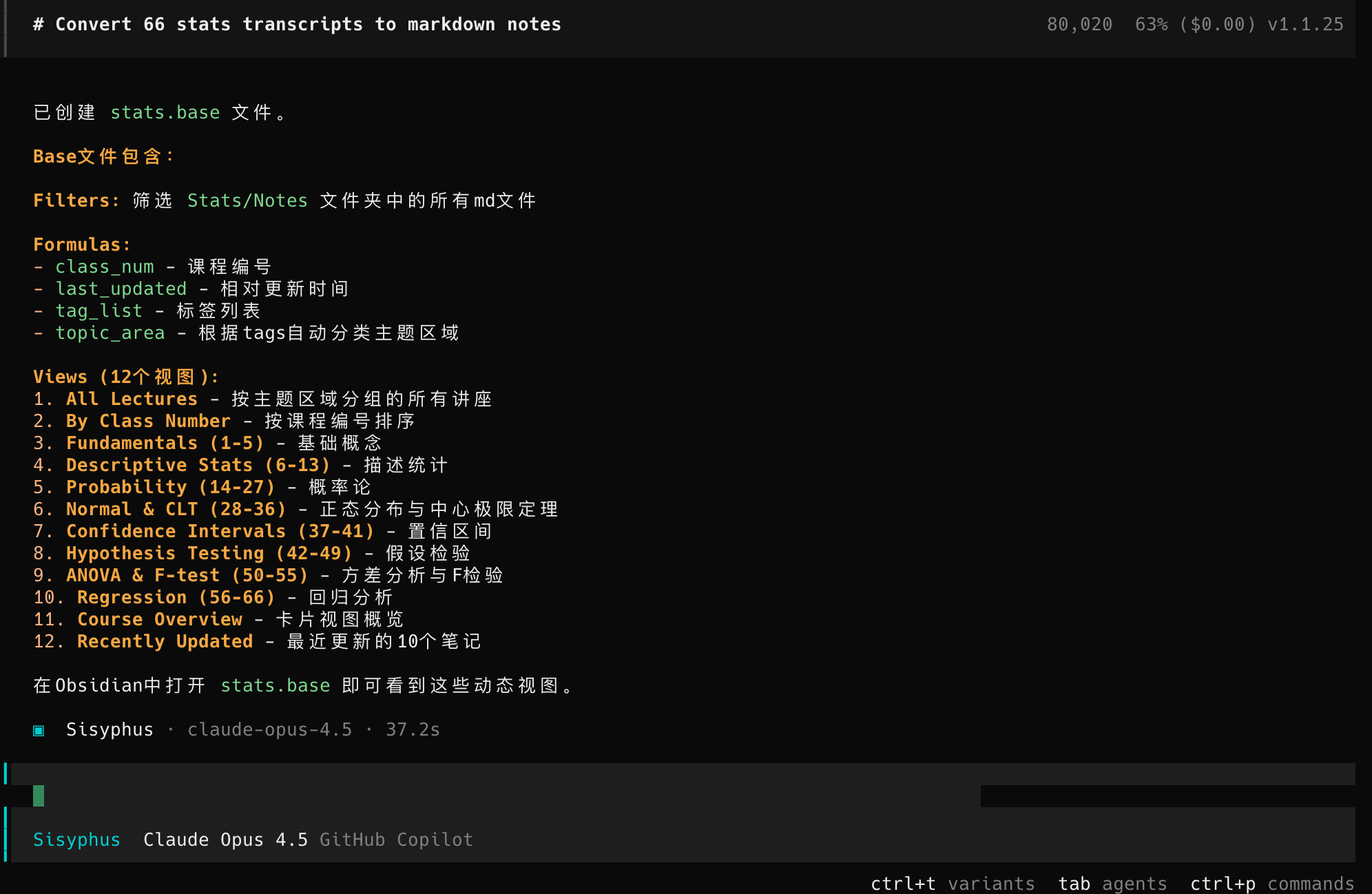 Today I conducted an experiment: using OpenCode to automate the entire process of downloading transcripts for 66 course videos, converting them into standard Obsidian Markdown notes, and building a knowledge base index—all within 20 minutes. This demonstrates the immense potential of Agentic AI in local automation workflows.
