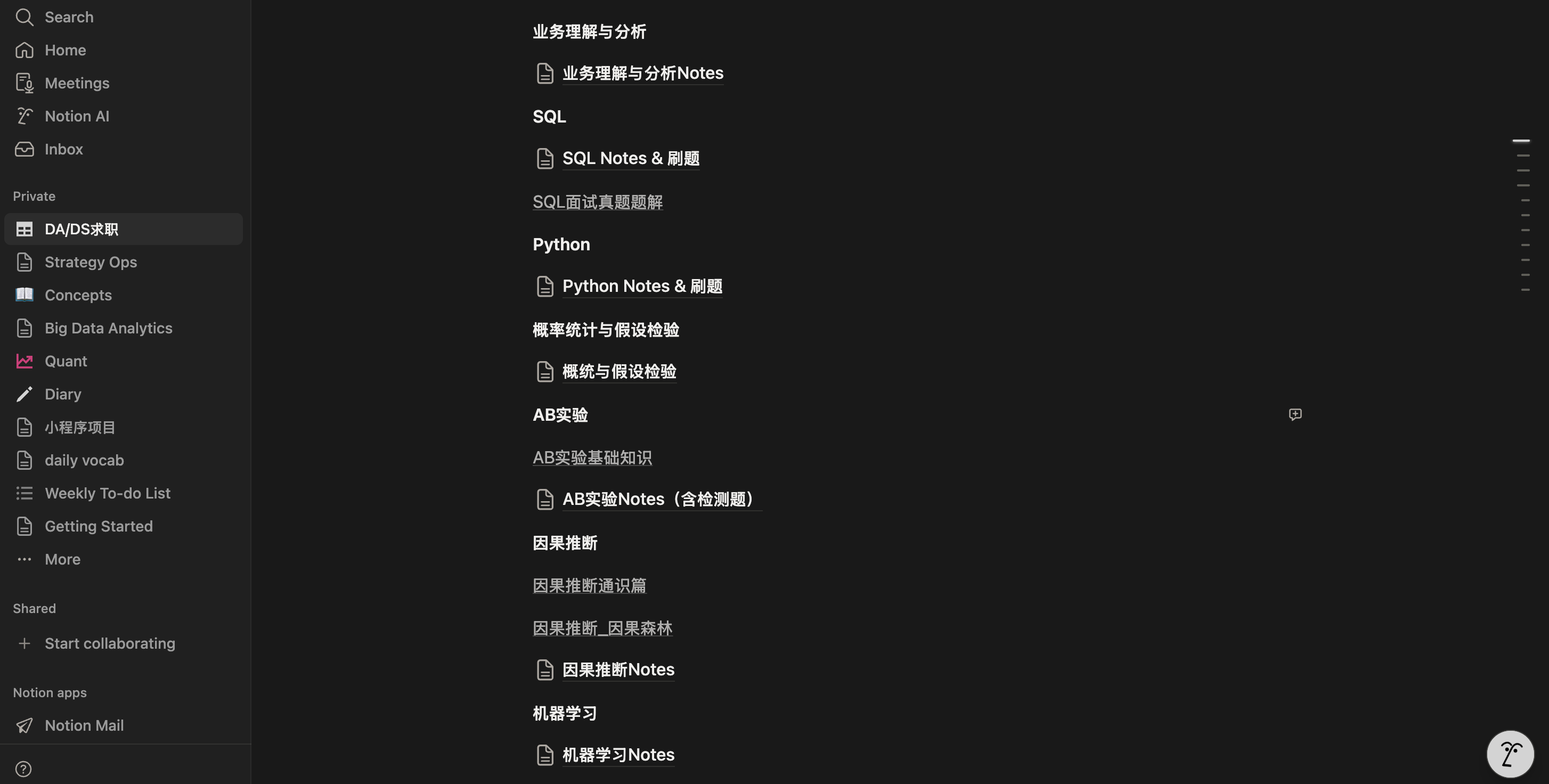 When I used Notion, I was a "brute-force" user. Although I knew power users could do fancy things, I was too lazy to learn those tricks. I just mechanically nested pages: creating a meta page for a topic (like "DS Interview Prep") and then piling up sub-pages for SQL, Python, Machine Learning, AB Testing, etc. In my sophomore year, I also tried Obsidian but gave up due to its overwhelming complexity.