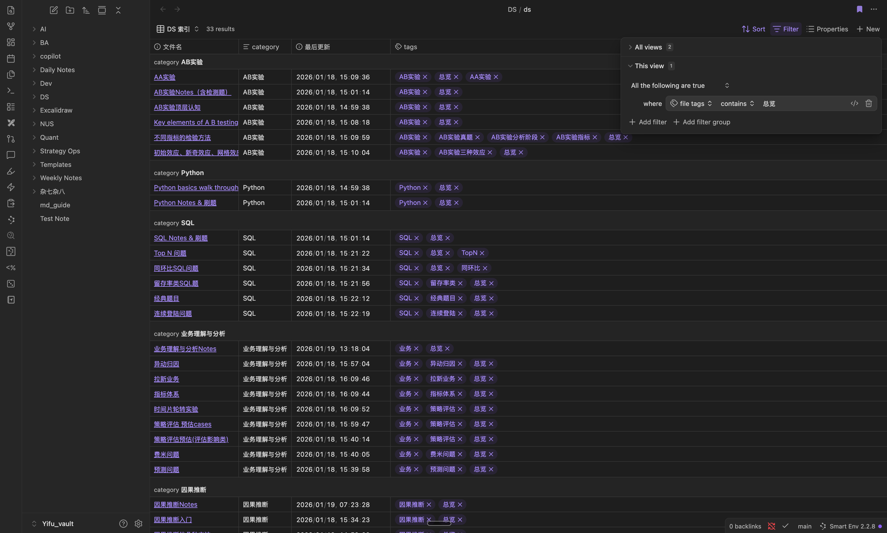 Taking "DS" as an example again, OpenCode created a ds.base file for me. I filtered out the index pages for various topics within "DS Interview Prep" using the condition tags contains 'Overview', creating a comprehensive navigation view. Of course, other customized views are possible, such as filtering for all AB Testing interview questions using category = 'AB Testing' and tags='Real Questions'.